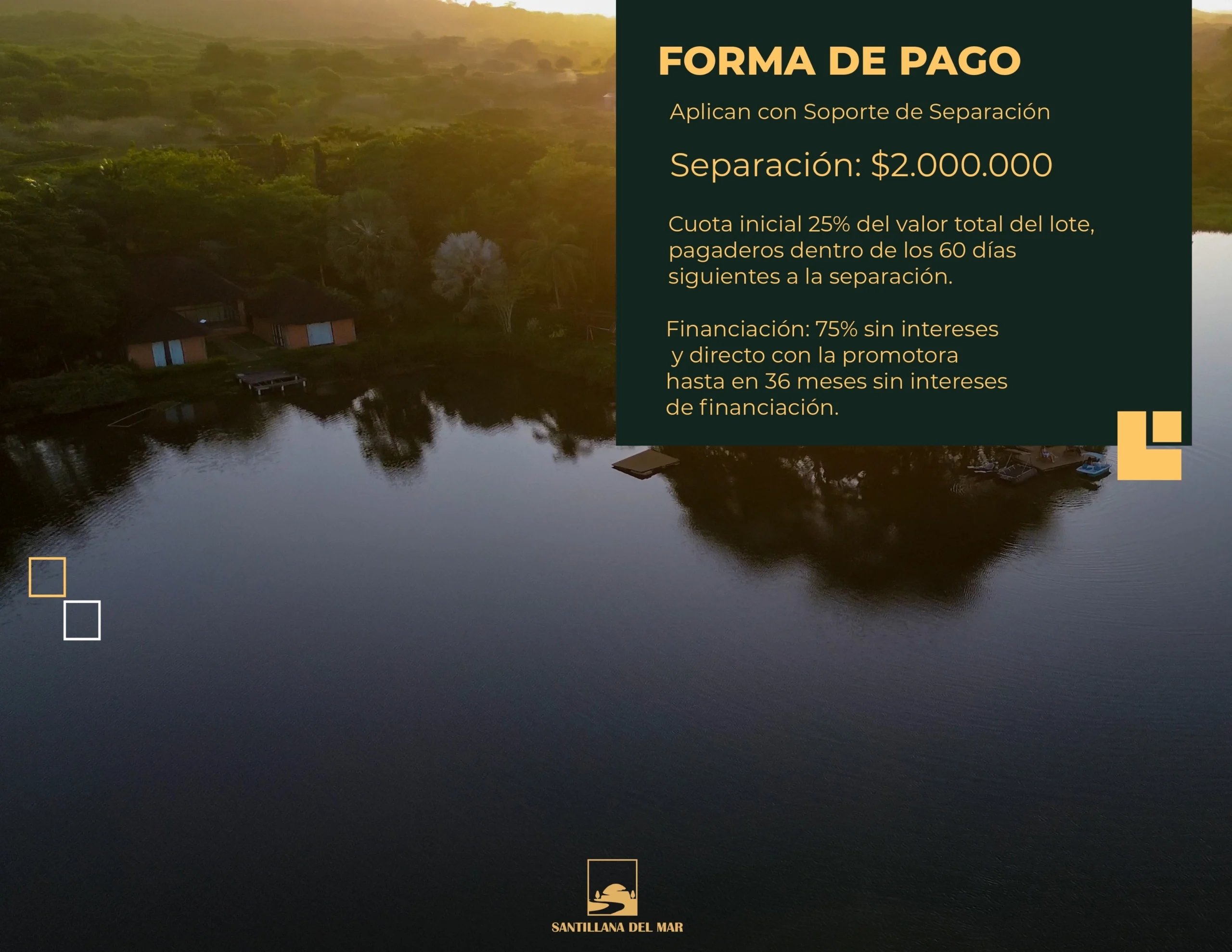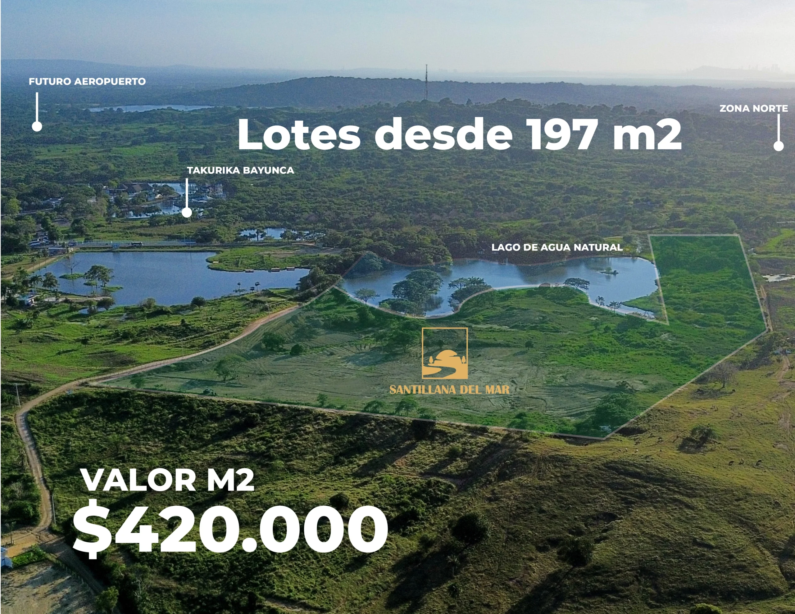 Descubre Santillana del Mar, el proyecto de lotes campestres más exclusivo de la Zona Norte de Cartagena, ubicado en el corregimiento de Bayunca. A solo 20 minutos del centro de la ciudad, 12 minutos del mar, 7 minutos del Centro Comercial Las Ramblas y 10 minutos del Hospital Serena del Mar, este condominio te ofrece una experiencia única con su lago natural, dos islas privadas y amenidades de primer nivel. Construye tu casa de ensueño con arquitectura moderna contemporánea en un entorno natural privilegiado, con financiación directa sin intereses hasta 36 meses.